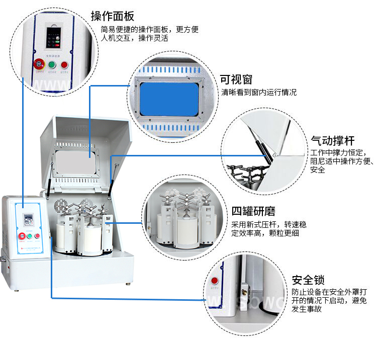 設備外殼采用方形設計元素,高精密模具沖壓成型,大方精致,高端穩重;機加零件采用數控加工工藝,行星盤整體鑄造成型,傳動齒輪選用特殊材質精密齒輪,確保設備高速運行時平穩安靜;磨罐壓緊裝置操作便捷、安全可靠。